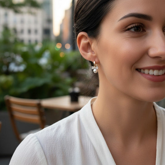 Apsudraboti riņķīšu auskari ar pērli un cirkonijiem – bantītes dizains