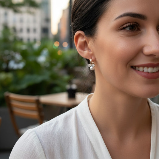 Apsudraboti riņķīšu auskari ar pērli un cirkonijiem – bantītes dizains