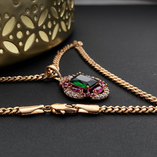 Gold-plated necklace with green and pink crystals
