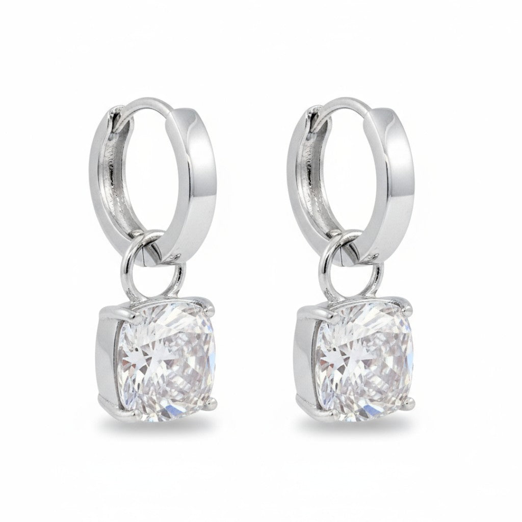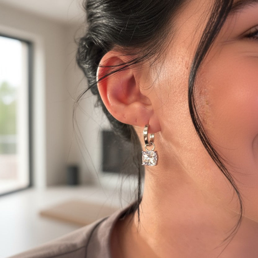 Eleganti un praktiski riņķīšu auskari ar mirdzošu cirkoniju piekariņu, ko iespējams noņemt, lai iegūtu divus dažādus valkāšanas stilus.