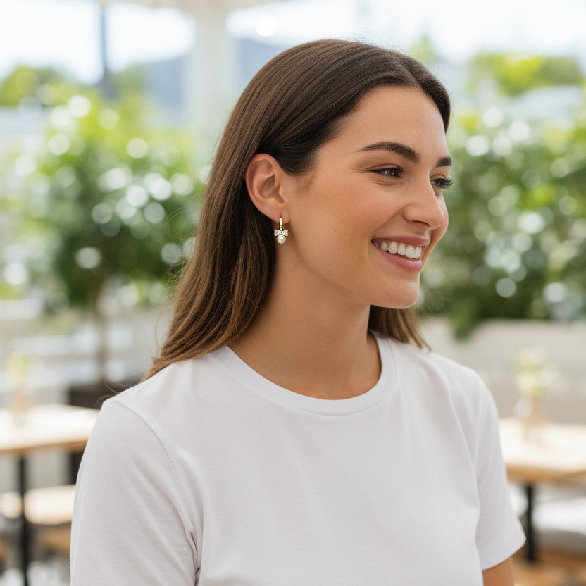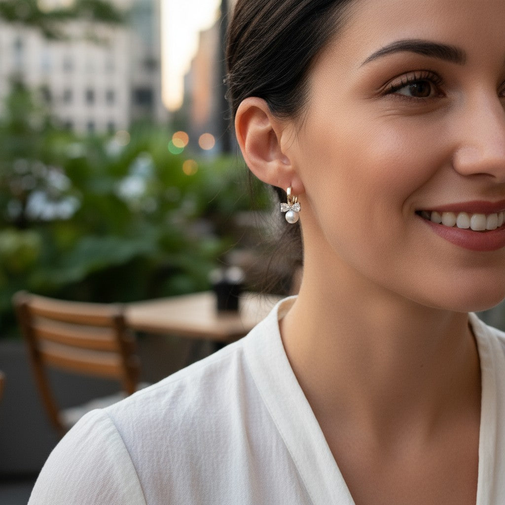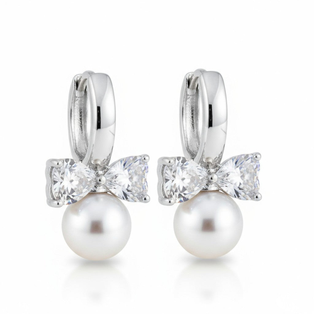 Izsmalcināti riņķīšu auskari, kas apvieno klasisko pērles eleganci ar mirdzošu cirkoniju rotātu bantīti.