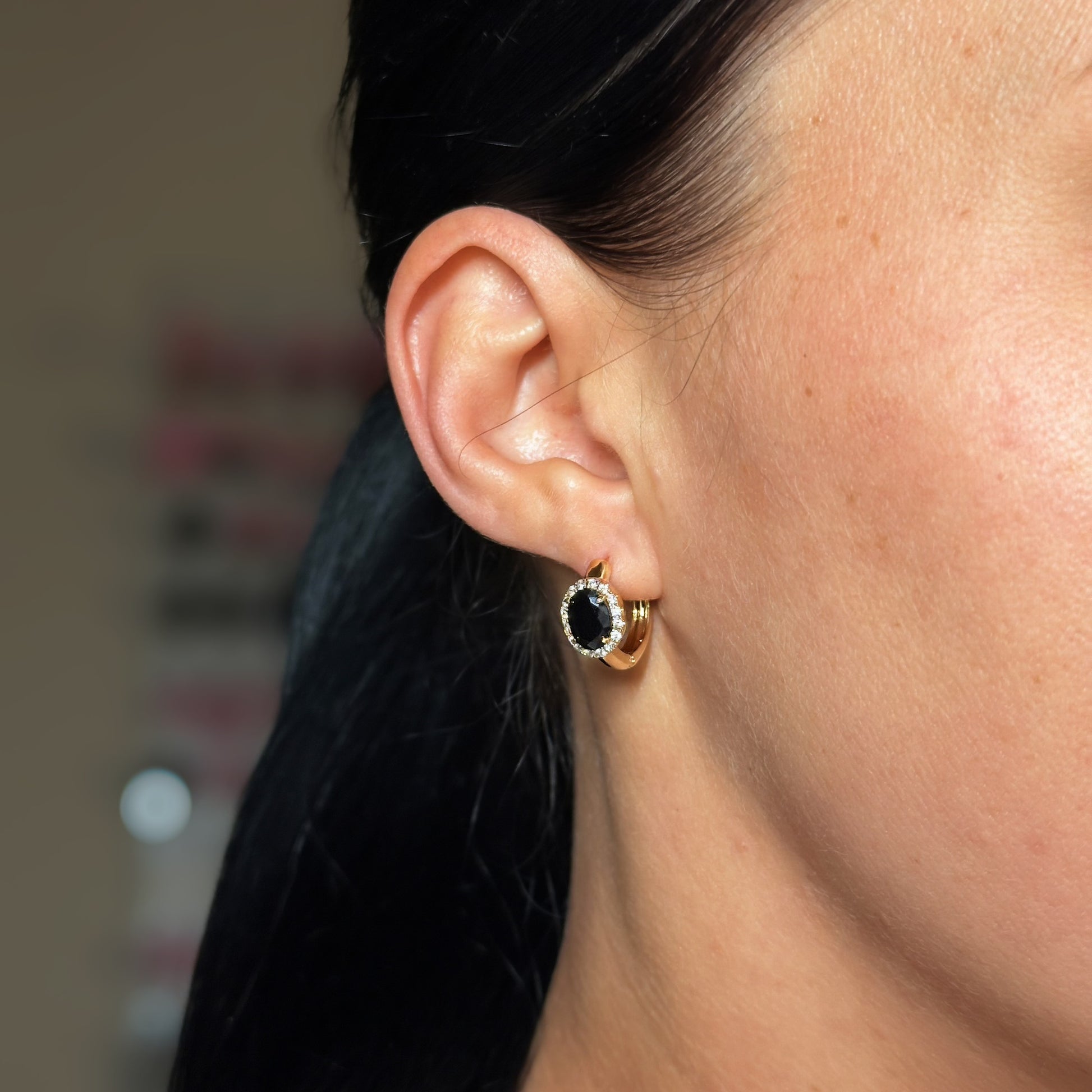 Eleganti 18k apzeltīti riņķīšu auskari ar izteiksmīgu melnu kubisko cirkoniju un mirdzošu akcentu apli. Klasisks dizains ar modernu noskaņu – piemērots gan ikdienai, gan vakaram.
